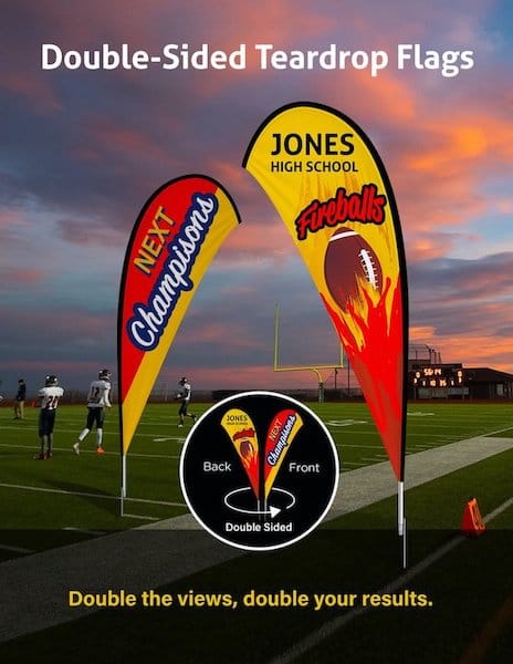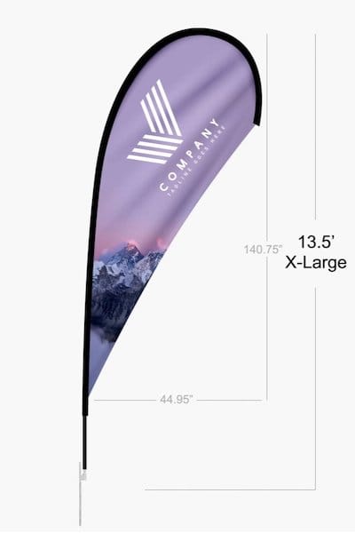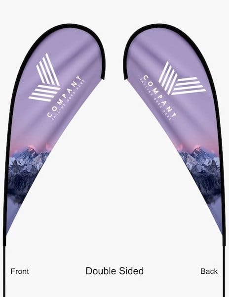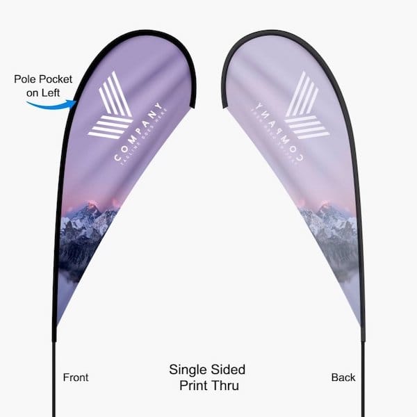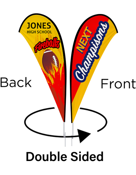Teardrop flags have an iconic curved flag shape that looks good indoor and out. These full-color dye-sublimated flags offer a large design space. Our mesh flag polyester is direct printed and then sublimated. This creates "Print thru" for single sided flags; full color and vibrant on the front - muted and mirrored but legible when viewed from the back.